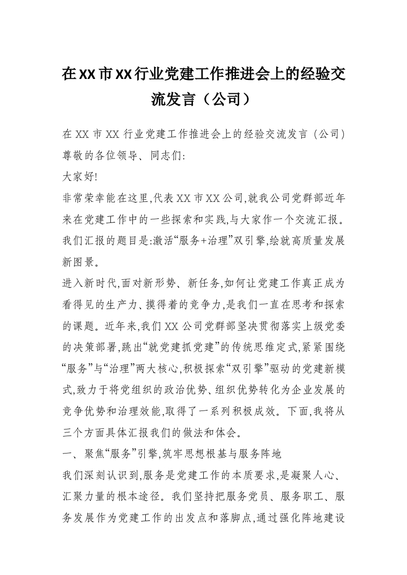 首页办公表格在XX市XX行业党建工作推进会上的经验交流发言(公司)