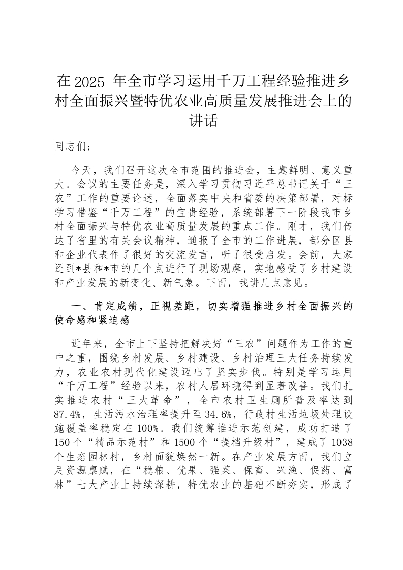 在2025年全市学习运用千万工程经验推进乡村全面振兴暨特优农业高质量发展推进会上的讲话