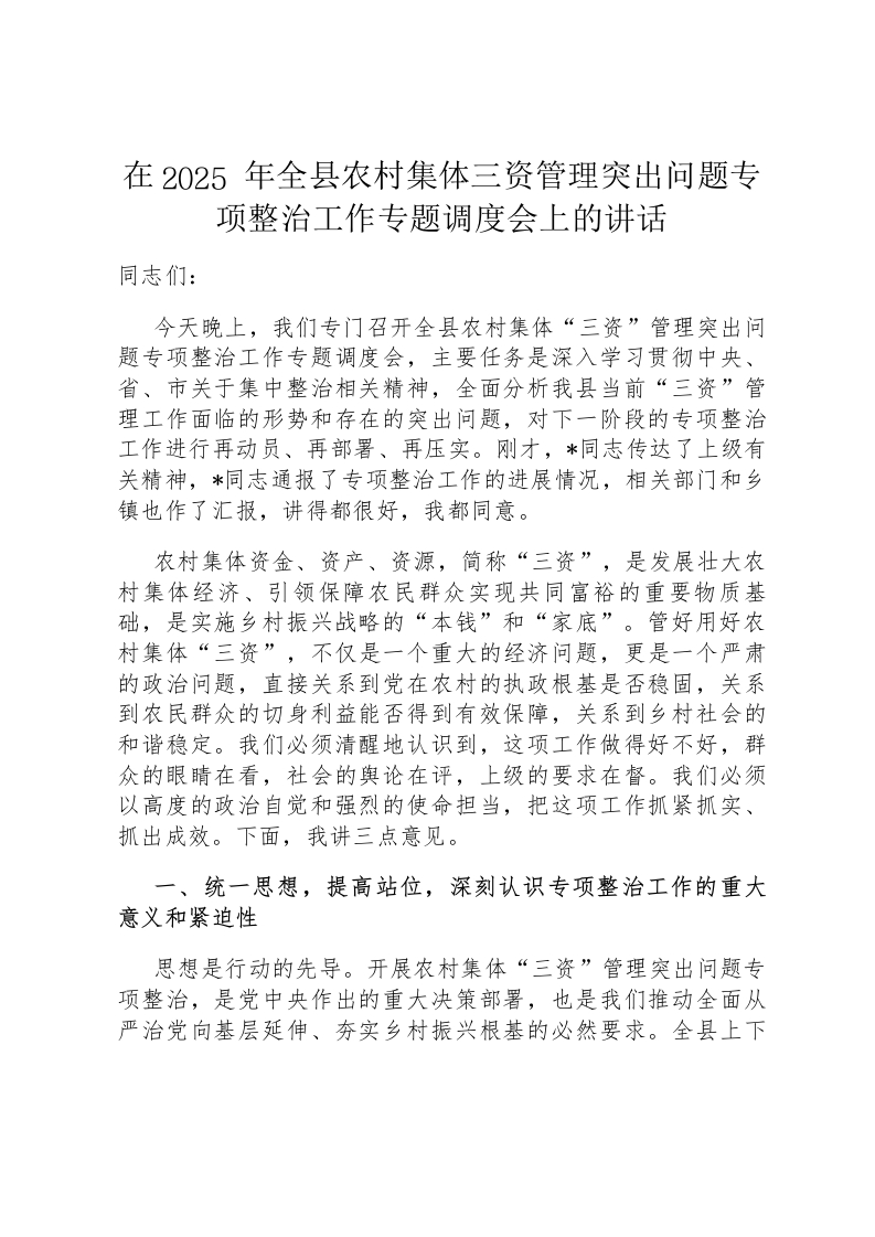 首页讲课讲稿在2025年全县农村集体三资管理突出问题专项整治工作专题调度会上的讲话