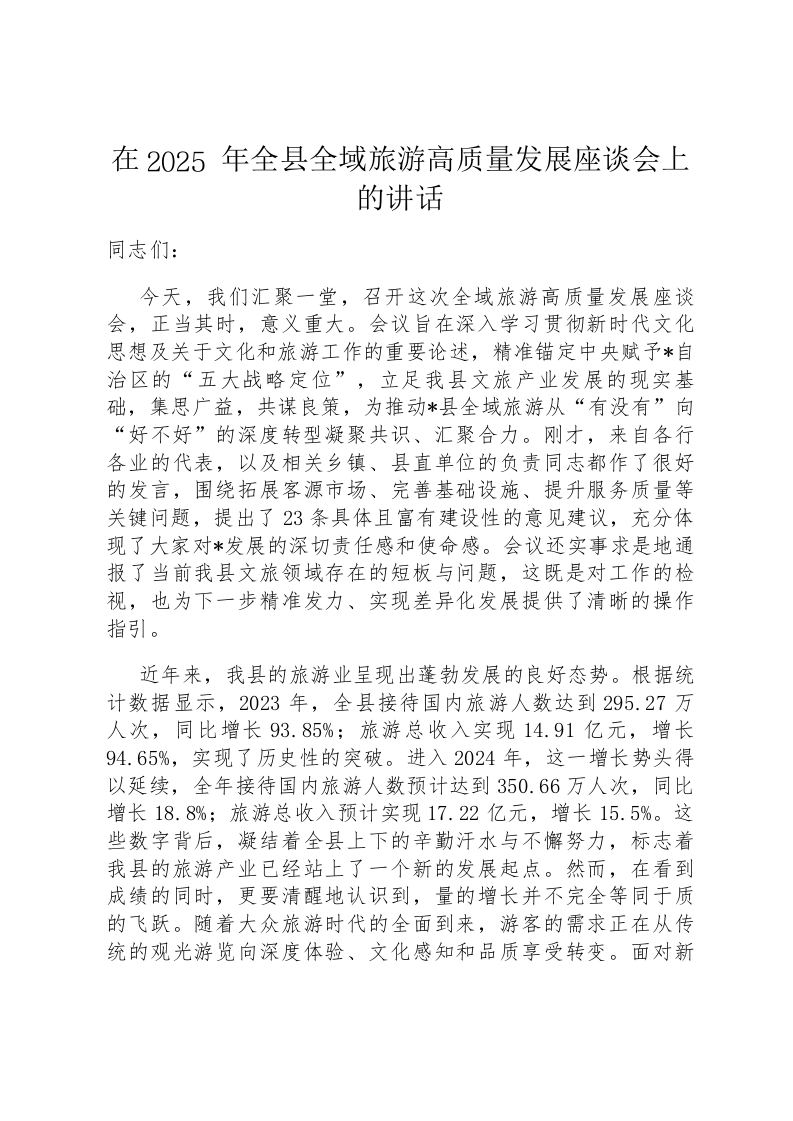 首页讲课讲稿在2025年全县全域旅游高质量发展座谈会上的讲话