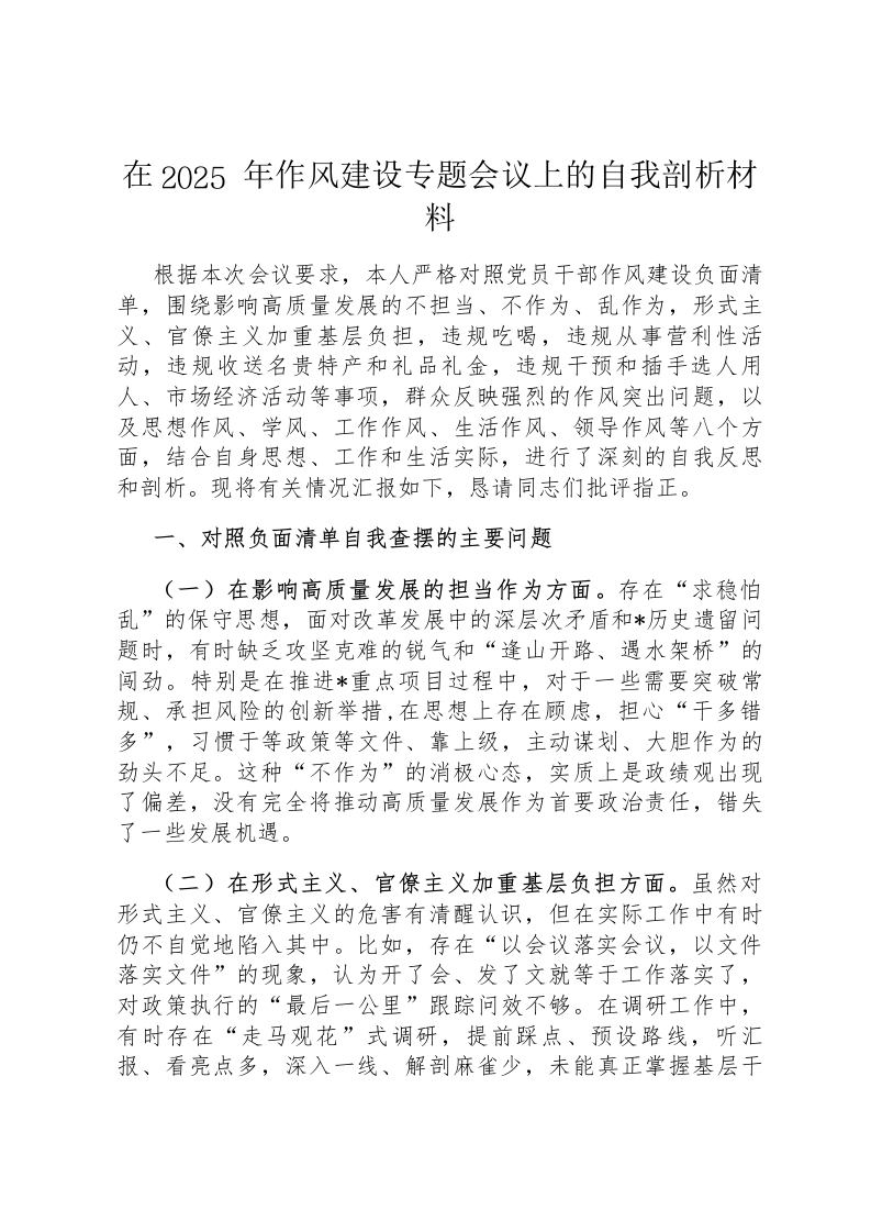 在2025年作风建设专题会议上的自我剖析材料