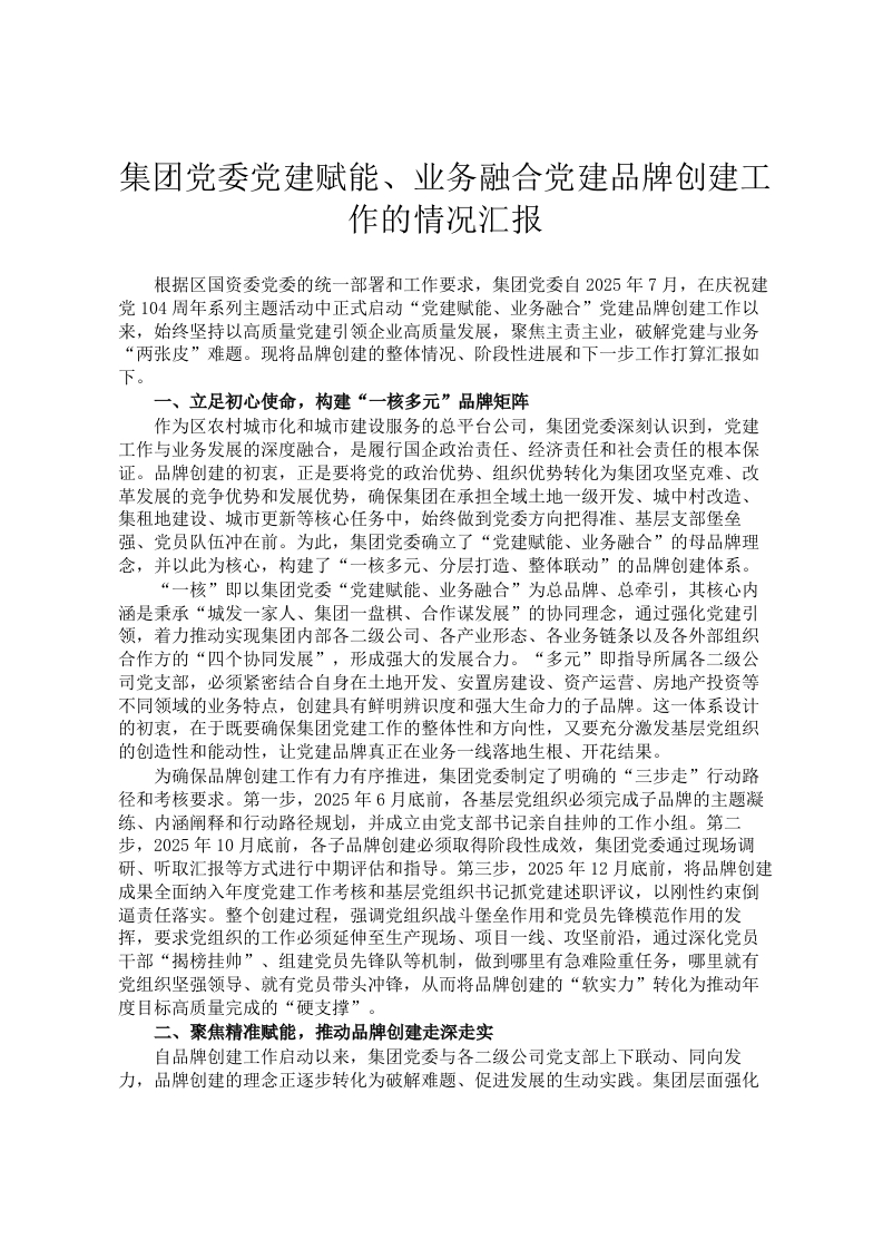 首页精选范文集团党委党建赋能、业务融合党建品牌创建工作的情况汇报