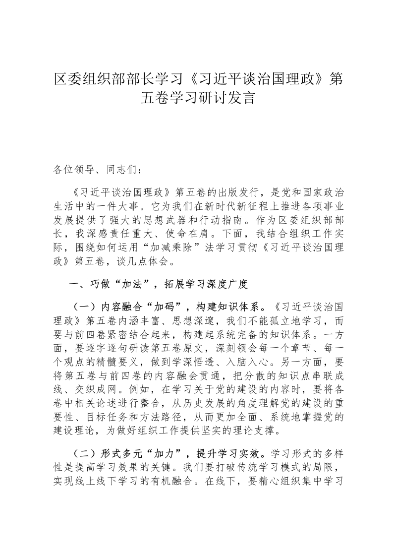 区委组织部部长学习《***谈治国理政》第五卷学习研讨发言