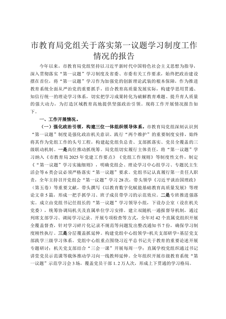 市教育局党组关于落实第一议题学习制度工作情况的报告