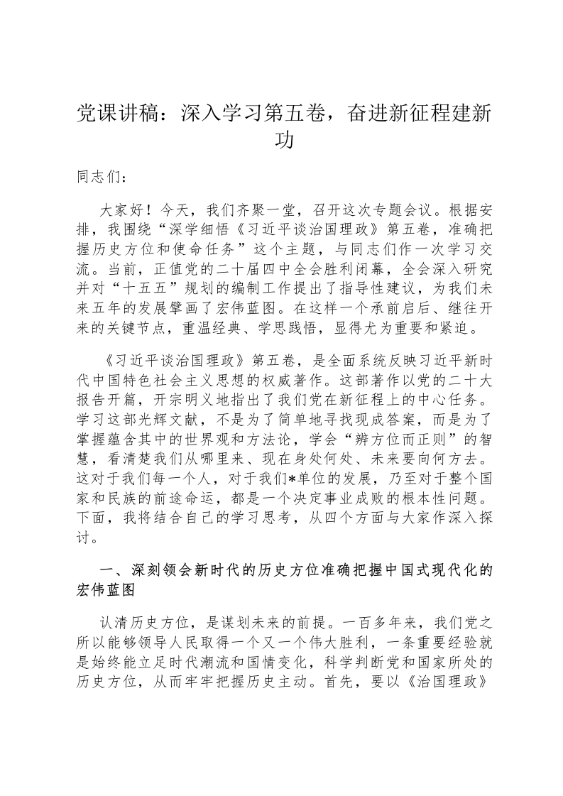党课讲稿:深入学习第五卷,奋进新征程建新功