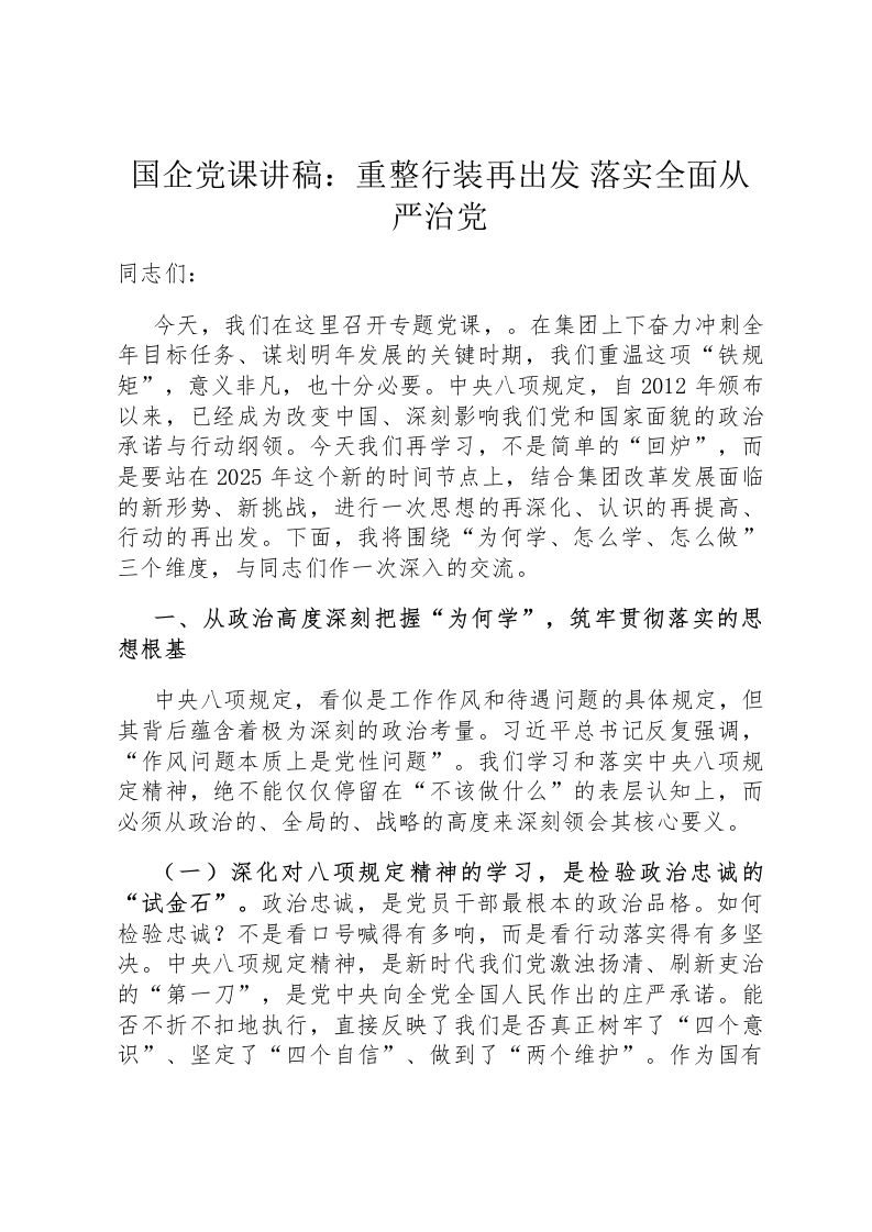 国企党课讲稿:重整行装再出发 落实全面从严治党