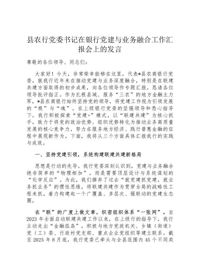 县农行党委书记在银行党建与业务融合工作汇报会上的发言
