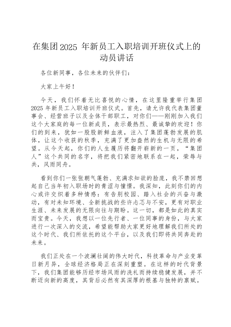 在集团2025年新员工入职培训开班仪式上的动员讲话