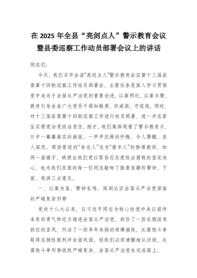 在2025年全县“亮剑点人”警示教育会议暨县委巡察工作动员部署会议上的讲话