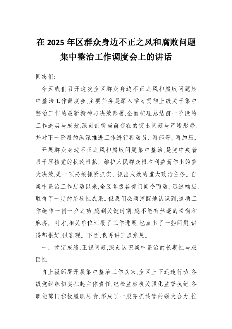 在2025年区群众身边不正之风和腐败问题集中整治工作调度会上的讲话