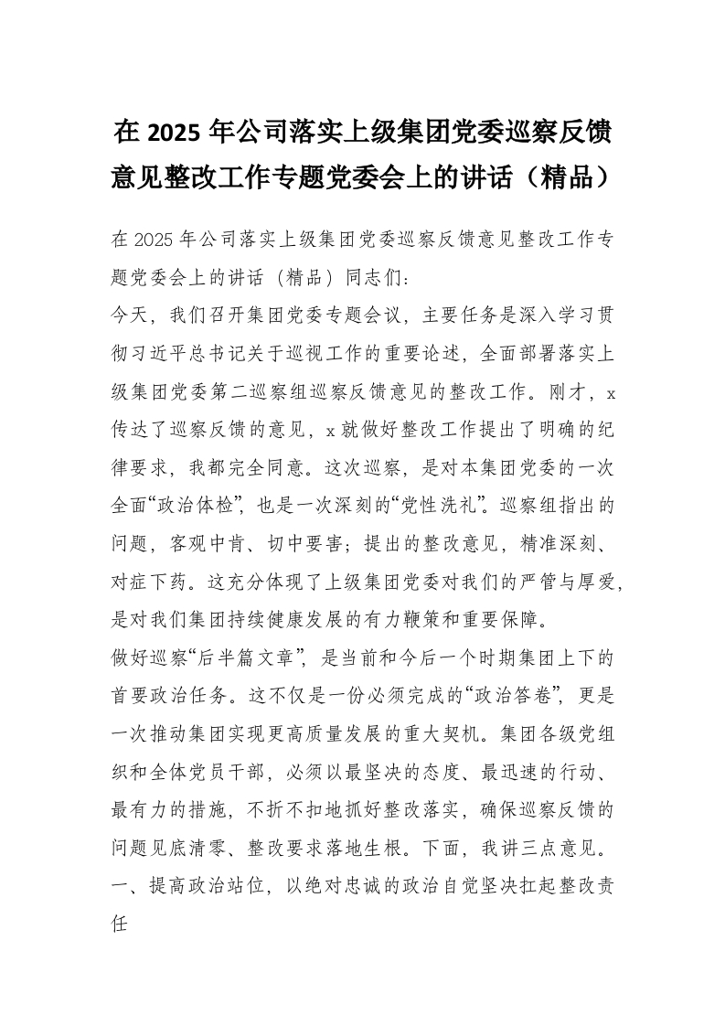 在2025年公司落实上级集团党委巡察反馈意见整改工作专题党委会上的讲话(精品)