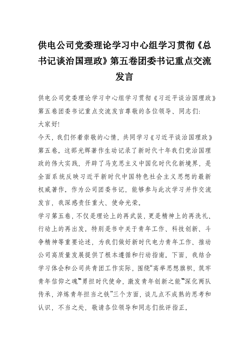 供电公司党委理论学习中心组学习贯彻《总书记谈治国理政》第五卷团委书记重点交流发言