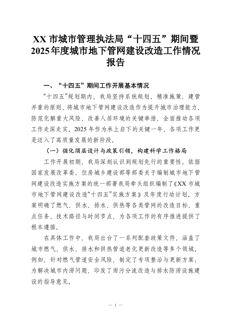 首页工作文档XX市城市管理执法局“十四五”期间暨2025年度城市地下管网建设改造工作情况报告