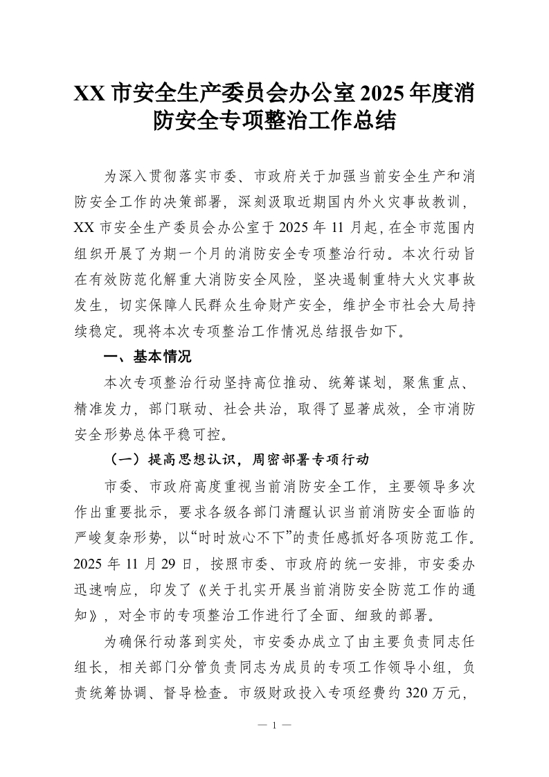 XX市安全生产委员会办公室2025年度消防安全专项整治工作总结