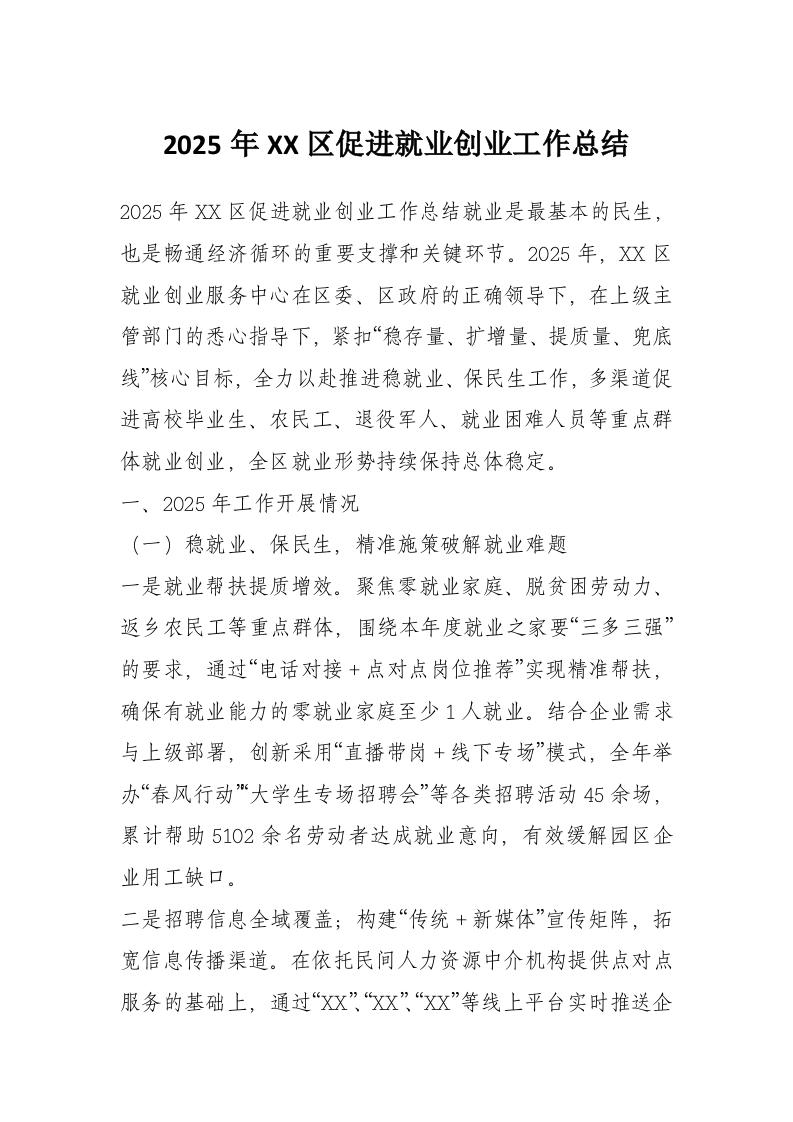 2025年XX区促进就业创业工作总结