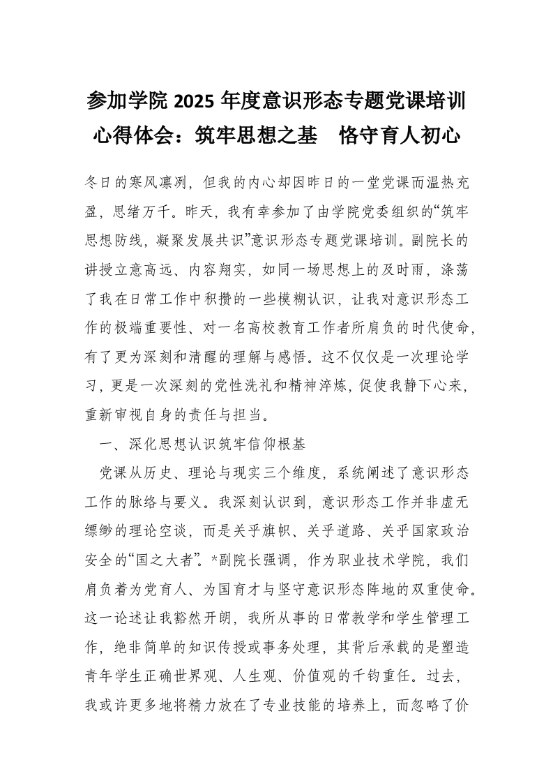 参加学院2025年度意识形态专题党课培训心得体会:筑牢思想之基 恪守育人初心