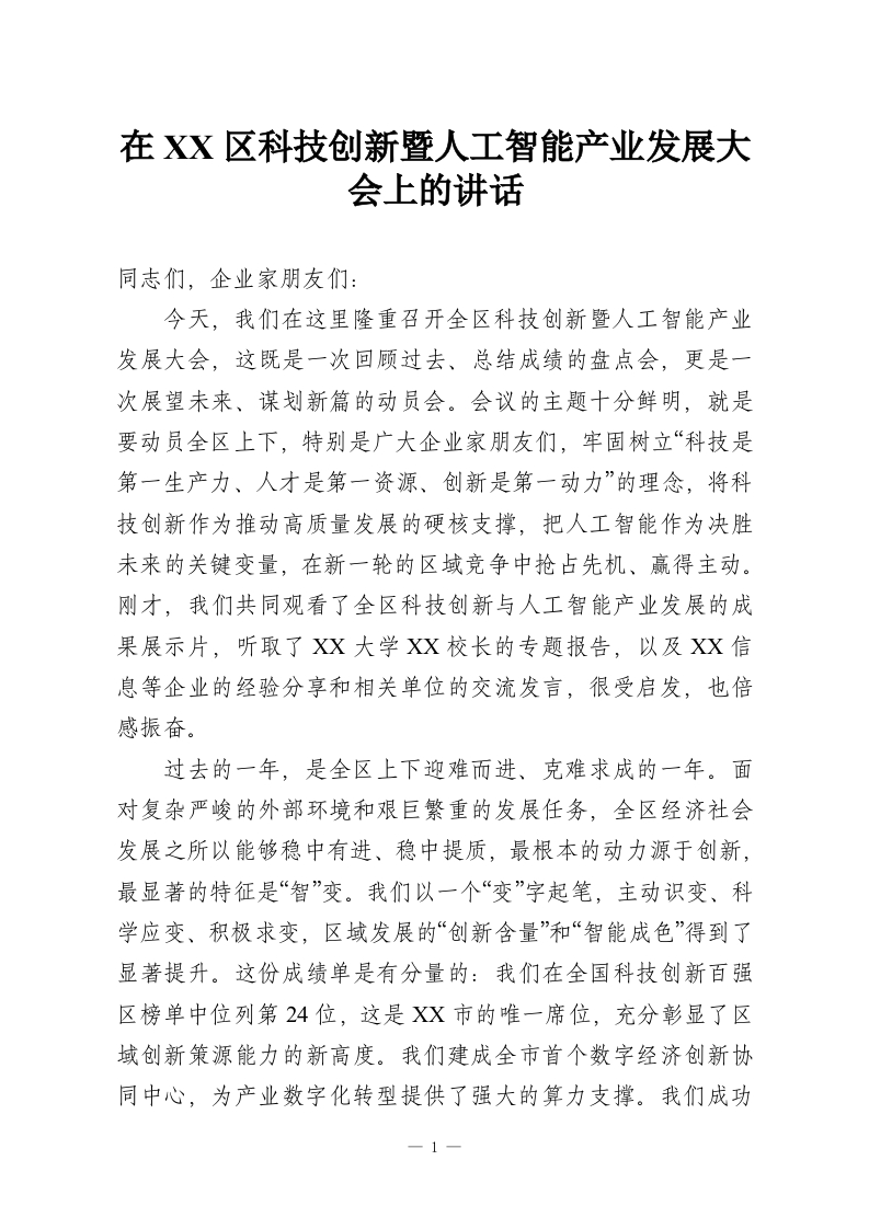 在XX区科技创新暨人工智能产业发展大会上的讲话