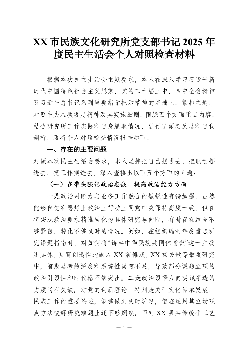 XX市民族文化研究所党支部书记2025年度民主生活会个人对照检查材料